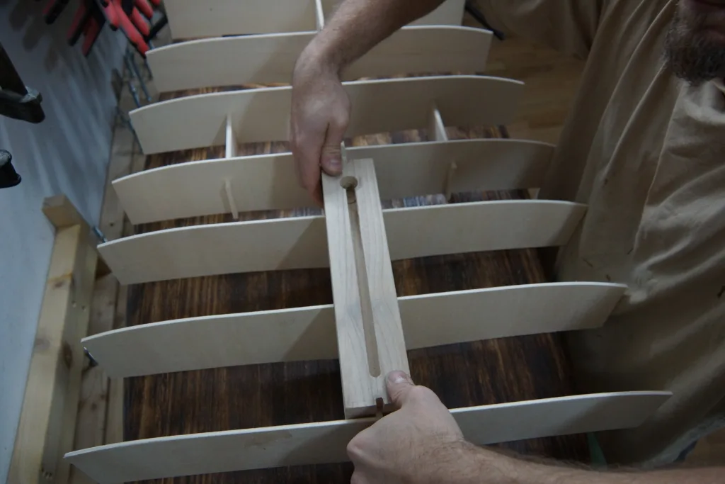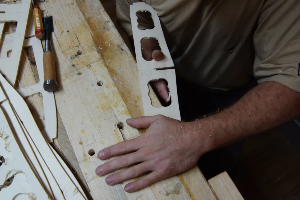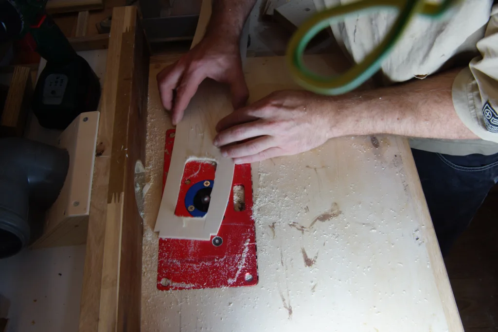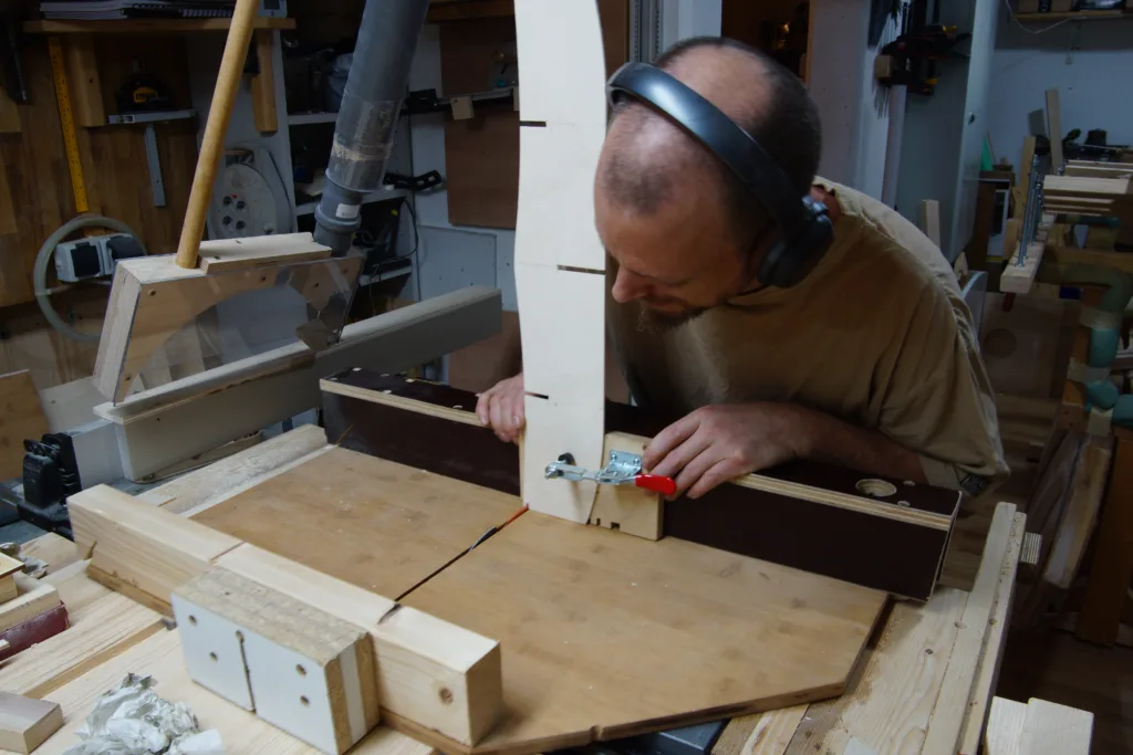 We like to cut out a square on the corners of the frames. In those squares a guideline out of Paulownia will be glued. To make those cuts easier, we use a selfmade sled and a clamp to keep the part in place.